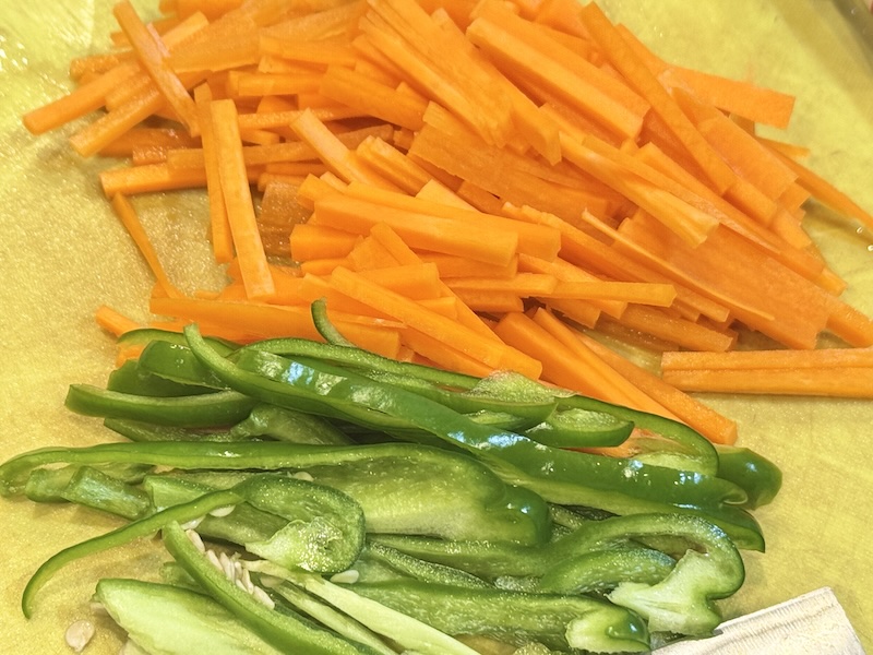 にんじん、ピーマン、油揚げを細切りにする。
