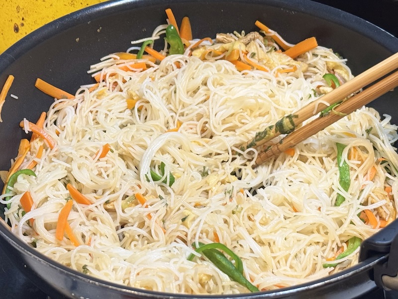 具材に火が通ったら茹でたビーフンを入れ、ほぐす。
